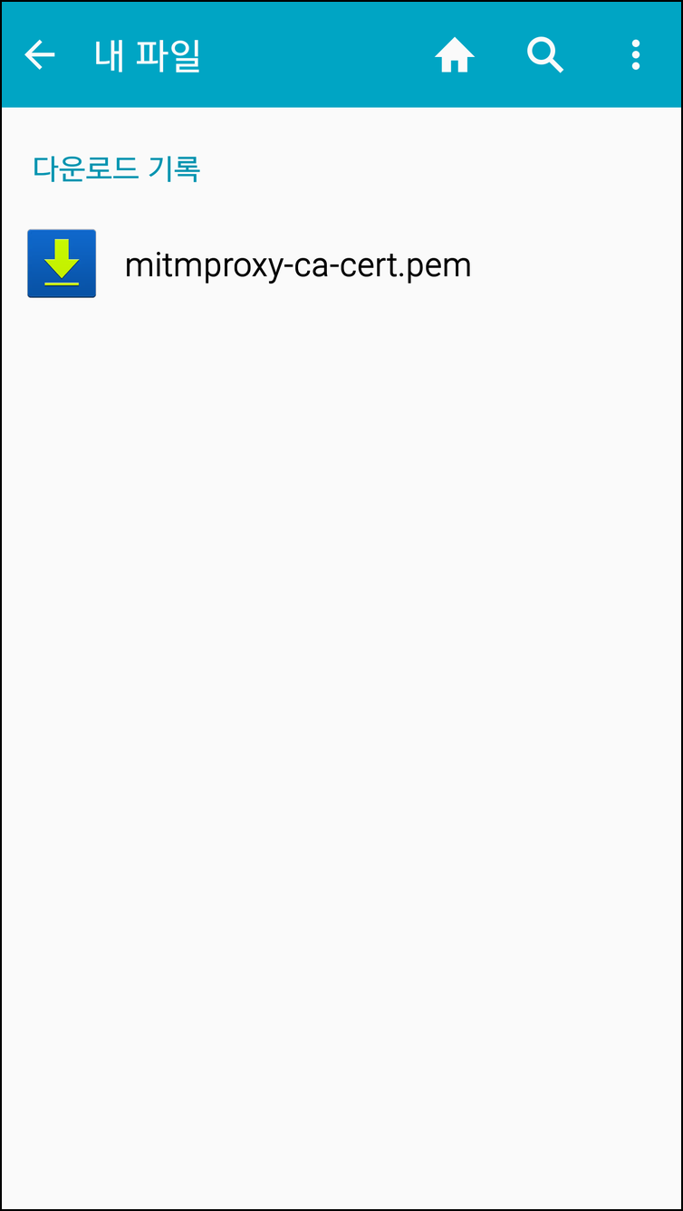 [그림9] mitmproxy certificate 안드로이드에선 다운받은 pem 파일을 그냥 터치해서 실행시키면 인증서가 등록된다. 다른 OS에서는 각자 인증서를 등록하는 방법에 맞게 인증서를 기기에 등록해준다. 여기까지 완료 했으면 mitmproxy를 사용할 수 있다. 앱을 실행하면 모든 패킷은 PC의 mitmproxy로 전송되어 패킷을 분석할 수 있다. mitmproxy만 사용해도 간단한 패킷을 분석할 수 있지만, mitmproxy에서는 패킷을 pcap 으로 export 할 수 없고, wireshark의 편리한 기능들을 이용하면 패킷 분석이 조금 더 용이하기 때문에 활용해보도록 한다.