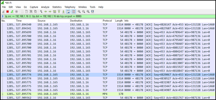그리고 이렇게 필터된 패킷을 따로 저장하고 싶을 경우, 우선 캡쳐를 중지한 다음 [Edit- Mark All Displayed] 를 선택하면 필터된 패킷에 마킹이 된다. 그리고 이어서 [File - Export Specified Packets]를 선택하면 마킹된 패킷만 저장할 수 있다.