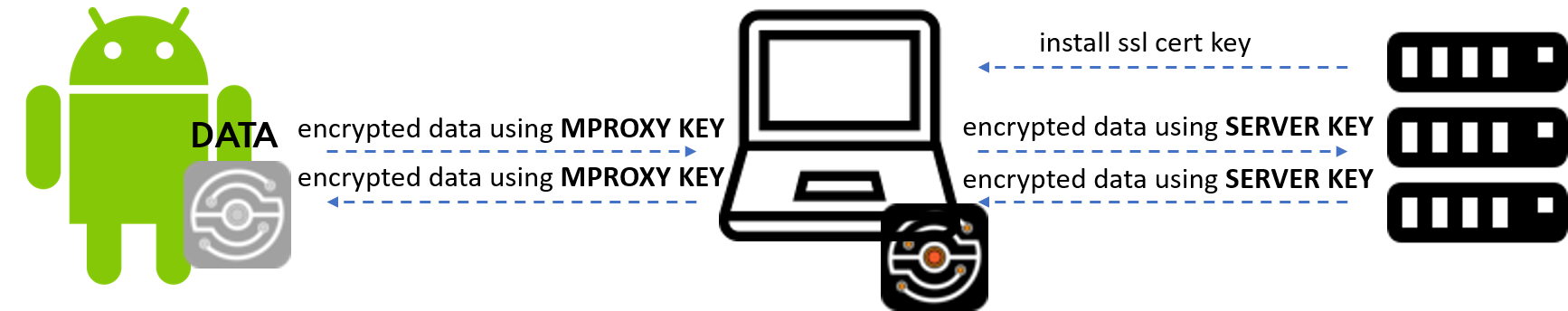 mitmproxy는 이런 클라이언트와 서버 사이에 위치하여, 자체 인증서를 클라이언트에 설치하게 하고, 클라이언트는이 인증서의 key를 이용해서 암호화하여 mitmproxy와 통신한다. mitmproxy는 서버에서 받은 key를 이용해서 데이터를 암호화하여 서버와 통신한다. 이러면 mitmproxy는 클라이언트와 서버 사이에서 오가는 패킷을 볼 수 있게 된다. 이를 활용해서 안드로이드 기기에서 발생하는 패킷을 PC의 wireshark 로 분석하는 방법을 소개한다. 안드로이드 뿐만 아니라 아이폰과 같은 다른 기기에서도 프록시 설정만 해주면 똑같이 패킷을 분석할 수 있기 때문에 참고해서 활용하면 된다.