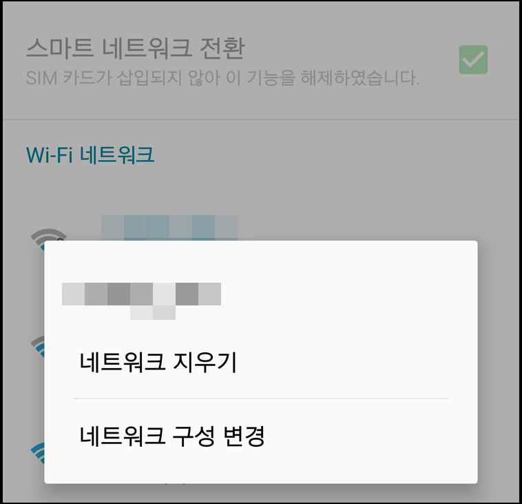 [그림5] android proxy 안드로이드에서 연결된 와이파이를 2초 정도 꾹 누르고 있으면, [그림5]와 같은 팝업 메뉴가 뜨고, 네트워크 구성 변경을 눌러준다.