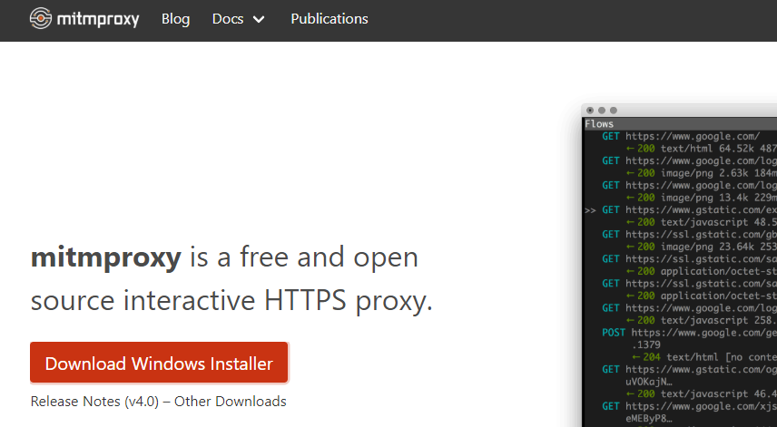 mitmproxy는 공식 홈페이지에서 OS별 설치방법이 잘 설명되어 있다. 윈도우의 경우 홈페이지에 접속해서 메인 페이지에 있는 download 버튼을 누르면 설치파일을 받을 수 있다.