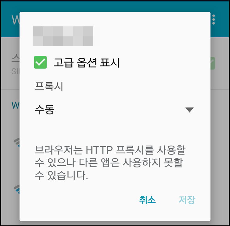 [그림6] android proxy 고급 옵션 표시에 체크를 한 다음, 프록시를 수동으로 맞춰준다.