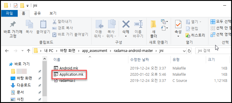 [그림 6] radamsa-android-master 압축을 해제하고 [jni] 디렉토리로 들어가보면, [그림 6]과 같이 세 개의 파일이 있는데, 우리가 수정해야할 파일은 "Application.mk" 파일이다