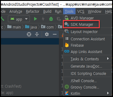 [그림 2] sdk manager 우선 Android Studio를 실행시킨 다음, [Tools - SDK Manager]를 클릭해서 SDK Manager를 띄운다.