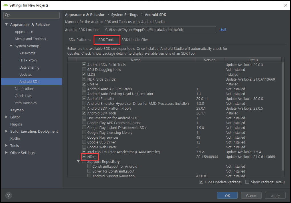 [그림 3] NDK 이어서 [SDK Tools]를 클릭한 다음 NDK에 체크를 해주고 아래쪽에 Apply 버튼을 눌러주면 NDK가 설치된다.