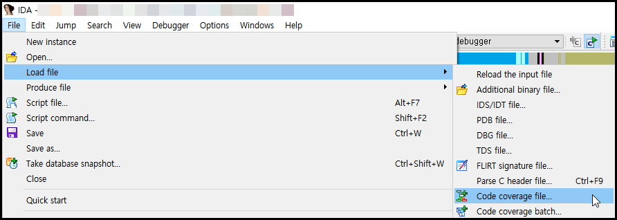 [그림 2] 실행방법 IDA에서 [Load file - Code coverage file...]을 눌러서 방금 생성된 로그파일을 열어주면 coverage 정보가 출력된다.