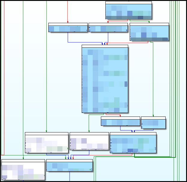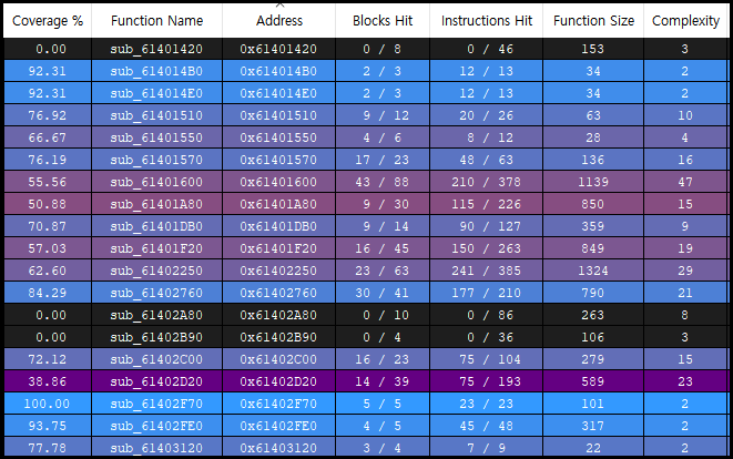 [그림 4] coverage graph [그림 3]과 [그림 4]와 같이 block 별로 몇 번 방문을 했는지 색깔로 구분이 되어있으며, flow graph 에서 방문한 곳과 하지 않은 곳이 구분되어 표시된다. 뿐만 아니라, IDA의 강력한 기능인 헥스레이(hexray)를 했을 때에도, 해당 코드가 실행됐는지 아닌지 표시되기 때문에 꽤나 편리하게 리버싱을 할 수 있다.