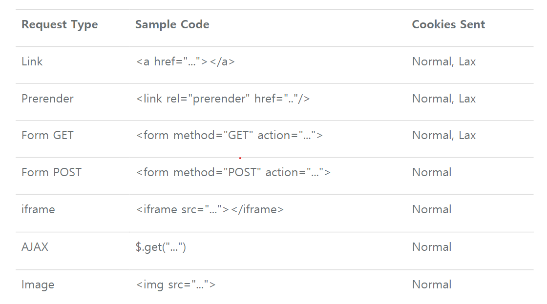 Same-site Cookie는 비교적 최근에 브라우저들에 적용된 세션 관련 정책이다. 로그인을 해서 세션이 발급될 때 "SESSIONID=VALUE; SameSite=Strict" 와 같이 서버에서 설정된 값으로 Same-site 값이 세션과 함께 브라우저에 저장된다. 그리고 해당 도메인으로 요청을 보낼 때 Same-site 가 아니면 세션값을 설정값에 따라 보낼지 말지 결정한다. 설정값은 크게 "Lax"와 "Strict" 가 있으며 설정값에 따른 세션 전송 여부는 아래와 같다.