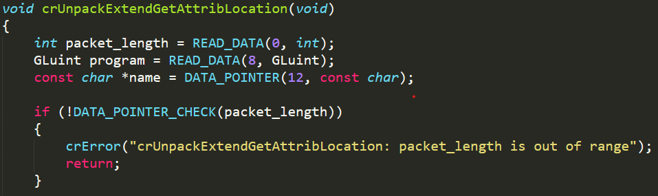 [CVE-2019-2548 patch] 다음 버전에서 패치된 코드를 보면 crUnpackExtendGetAttribLocatoin 함수에서 packet_length의 범위를 검사하는 로직을 추가했고 crServerDispatchReadPixels 함수에서도 bytes_per_row와 height의 범위 검사를 수정해서 취약점을 패치했다.