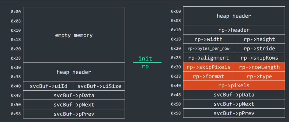 https://labs.f-secure.com/assets/BlogFiles/offensivecon-2019-3d-accelerated-exploitation-jason-matthyser.pdf f-secure 문서에 이쁜 그림이 있어서 가져왔다. empty memory가 앞에서 free한 공간이고 오른쪽이 free된 공간에 readpixels 메시지가 할당되어 들어가고 heap overflow로 다음 chunk에 있던 CRVBOXSVCBUFFER_t 의 uiId와 uiSize 부분이 덮힌걸 볼 수 있다.