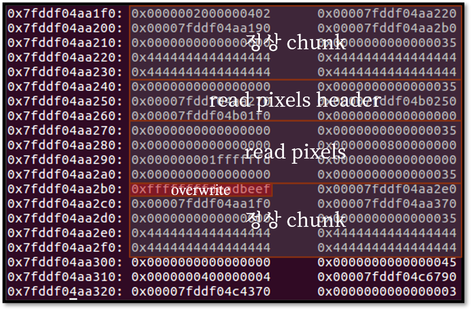 [readpixels crMessage] 그리고 overwrite가 정상적으로 되는지 테스트하기 위해 위와같이 readpixels message를 만들어서 전송한다. format 위치에 0x35를 넣은 이유는 overwrite 할 chunk의 heap header에 size 값을 똑같이 유지해주기 위함이다. 제일 마지막줄은 pixels에 들어갈 값이다.