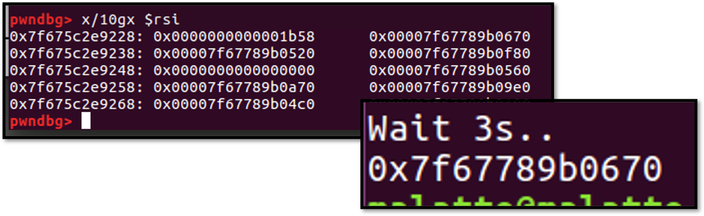 [print return value] 값을 확인하고 continue를 해주면 위와같이 출력이 된다. crMessage의 리턴값중 8~16byte에 해당하는 부분이 앞에서 gdb로 본 cr_unpackData + 8 위치에 있는 값이 출력되었고 16~24byte에 해당하는 부분은 첫 8byte가 출력된 것을 확인할 수 있다. 즉 우리는 packet_length 값을 통해서 memory arbitrary read를 할 수 있게된다.