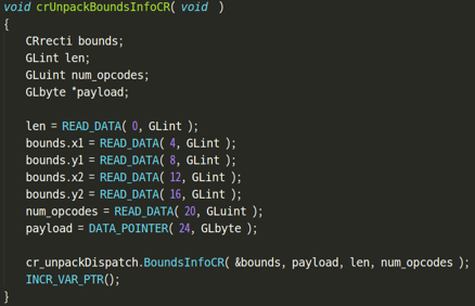 그렇기 때문에 우리가 exploit 하기 위해선 opcode로 호출가능한 함수중 이 crSpawn과 인자값을 비슷하게 받는 함수를 찾아서 함수테이블에서 해당 함수의 주소를 crSpawn으로 바꾸고 opcode를 이용해서 호출하는 방법을 사용할 수 있다. gdb에서 cr_unpackDispatch 테이블을 살펴보거나 소스코드에서 검색해보면 crServerDispatchBoundsInfoCR 라는 함수가 우리가 원하는 조건과 비슷하다는걸 알 수 있다.