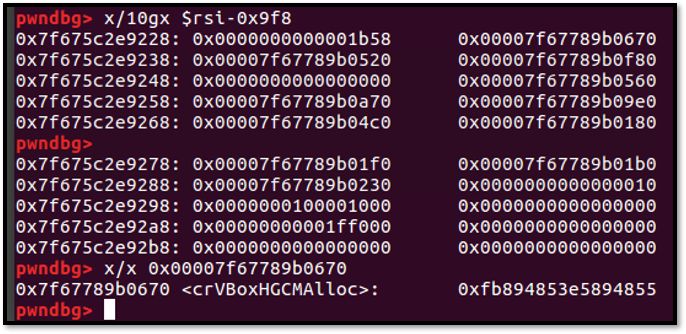 gdb에서 디버깅할 때 parseheap과 같은 heap 명령어는 vbox의 heap 공간이 워낙 방대하기 때문에 분석하기 어렵다. 대신에 search –t qword “0xffffffffdeadbeef” 와 같이 검색하면 해당 값이 들어있는 메모리 공간들을 찾아서주기 때문에 비교적 쉽게 디버깅할 수 있다.