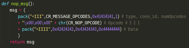 [crmessage sample] 우리가 보내야하는 데이터의 형태는 위 [crmessage struct]와 같으며 아래는 이를 파이썬 코드로 나타낸 것이다. conn_id는 아무 값이나 줘도 정상적으로 동작한다. chromium 서버는 해당 메시지를 받으면 해당 opcode에 해당하는 함수를 cr_unpackDispatch 라는 함수 테이블에서 찾아 호출한다.